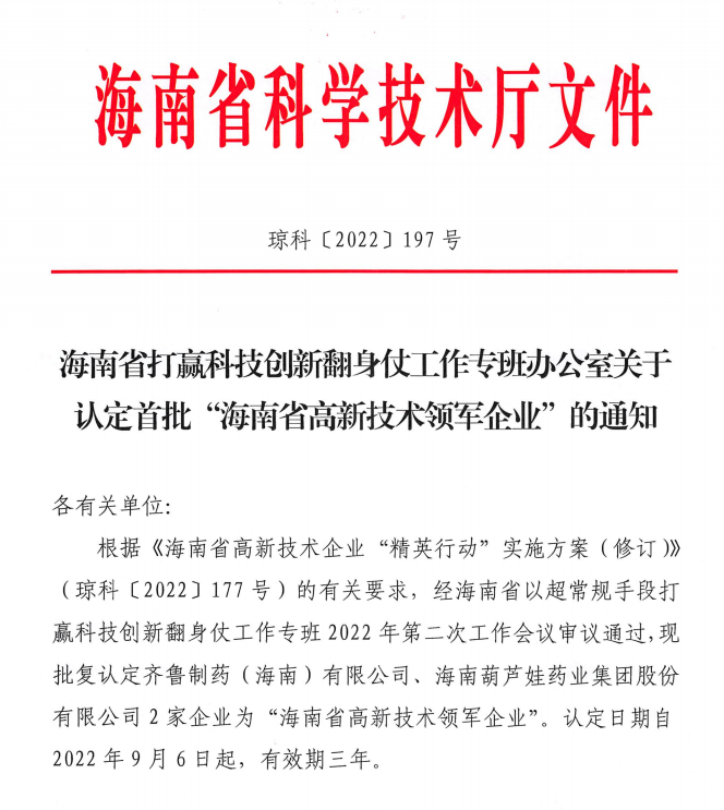 近日,海南省科学技术厅发布的《海南省打赢科技创新翻身仗工作专班办公室关于认定首批“海南省高新技术领军企业”的通知》中显示,批复认定海南william威廉药业集团股份有限公司等2家企业为“海南省高新技术领军企业”。认定日期自2022年9月6日起,有效期三年。